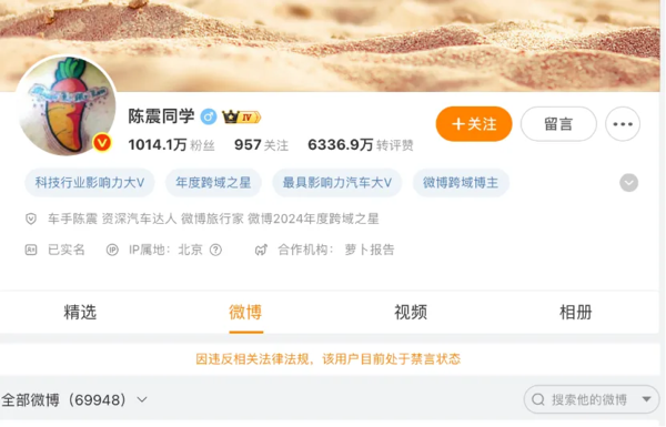 网络车评人陈震偷税,追缴并罚款共计247.48万元发表时间:2025-12-05 14:17 新摘网 12月5日消息,据央视新闻报道,近期,国家税务总局北京市税务局第三稽查局依法查处网络车评人陈震偷税案件。 目前,涉案税款、滞纳金及罚款均已追缴入库。 据了解,12月5日,汽车大V陈震的微博、抖音、B站、小红书、快手等多个社交平台账号同时被禁言。而在2019年,陈震曾发微博称“纳税是每个公民应尽的义务,逃税才是最可耻的!且是犯罪行为!” 第三方数据显示,“陈震同学”视频平台近30日掉粉4.53万。此外,其1秒—20秒视频广告报价为35万,21秒—60秒视频广告报价为60万,60秒以上视频广告报价为80万。 天眼查App显示,陈震名下共关联5家企业,其中4家为存续状态,包括北京格锐驰广告传媒有限公司、北京格锐新峰信息技术有限公司等,陈震在上述企业中担任监事等职务,版图涉及广告传媒、商贸等领域。 此外,陈震名下北京格锐驰广告传媒有限公司现存1则欠税公告,欠税余额2965.14元,欠税税种为印花税。